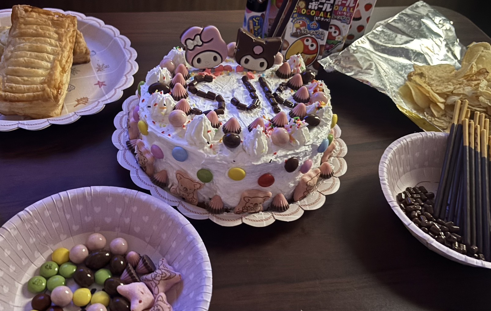 普通のケーキはいちごとかふるーついっぱい乗っけるけど今回はおかしいっぱいのせてきました!!